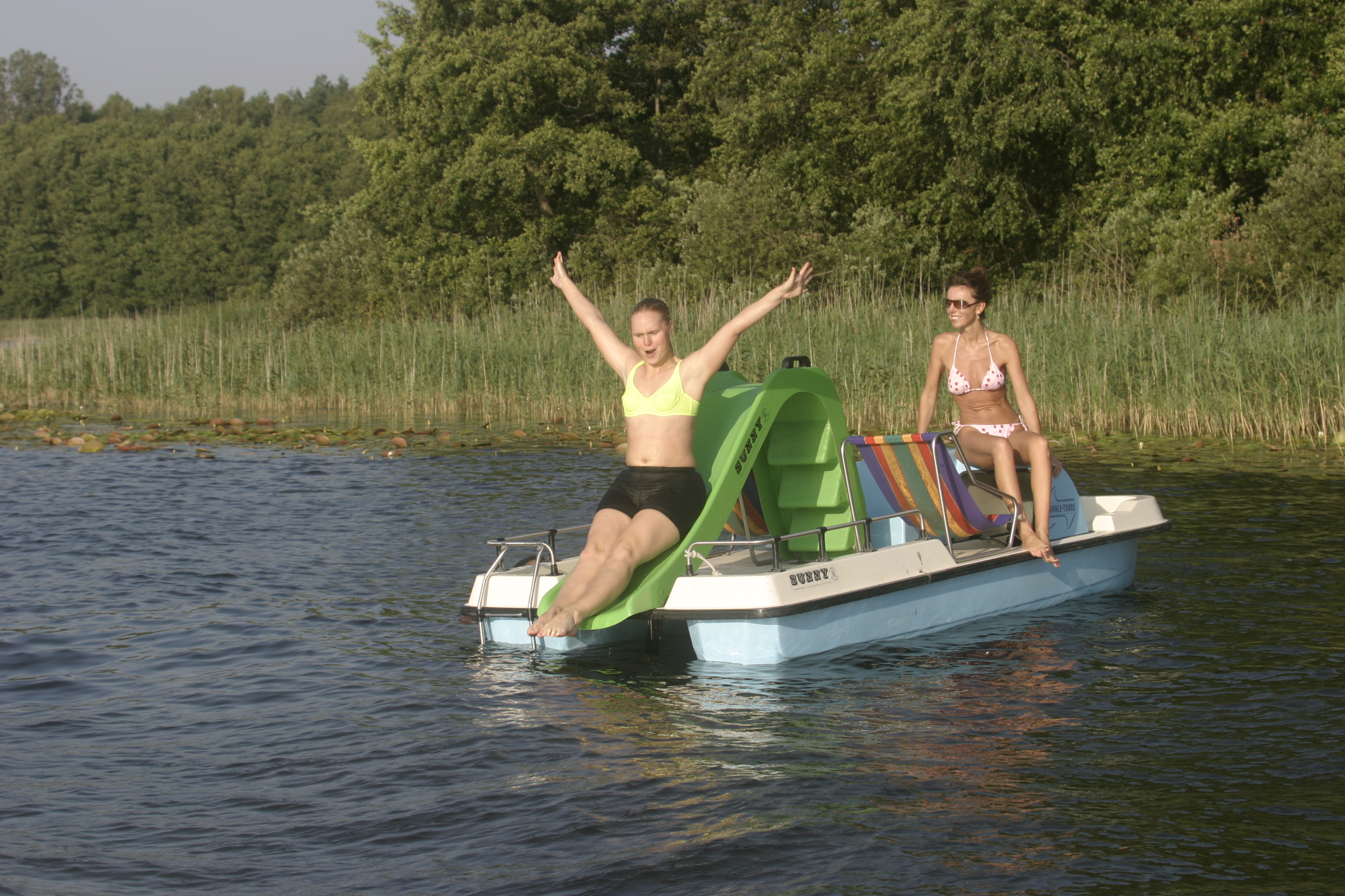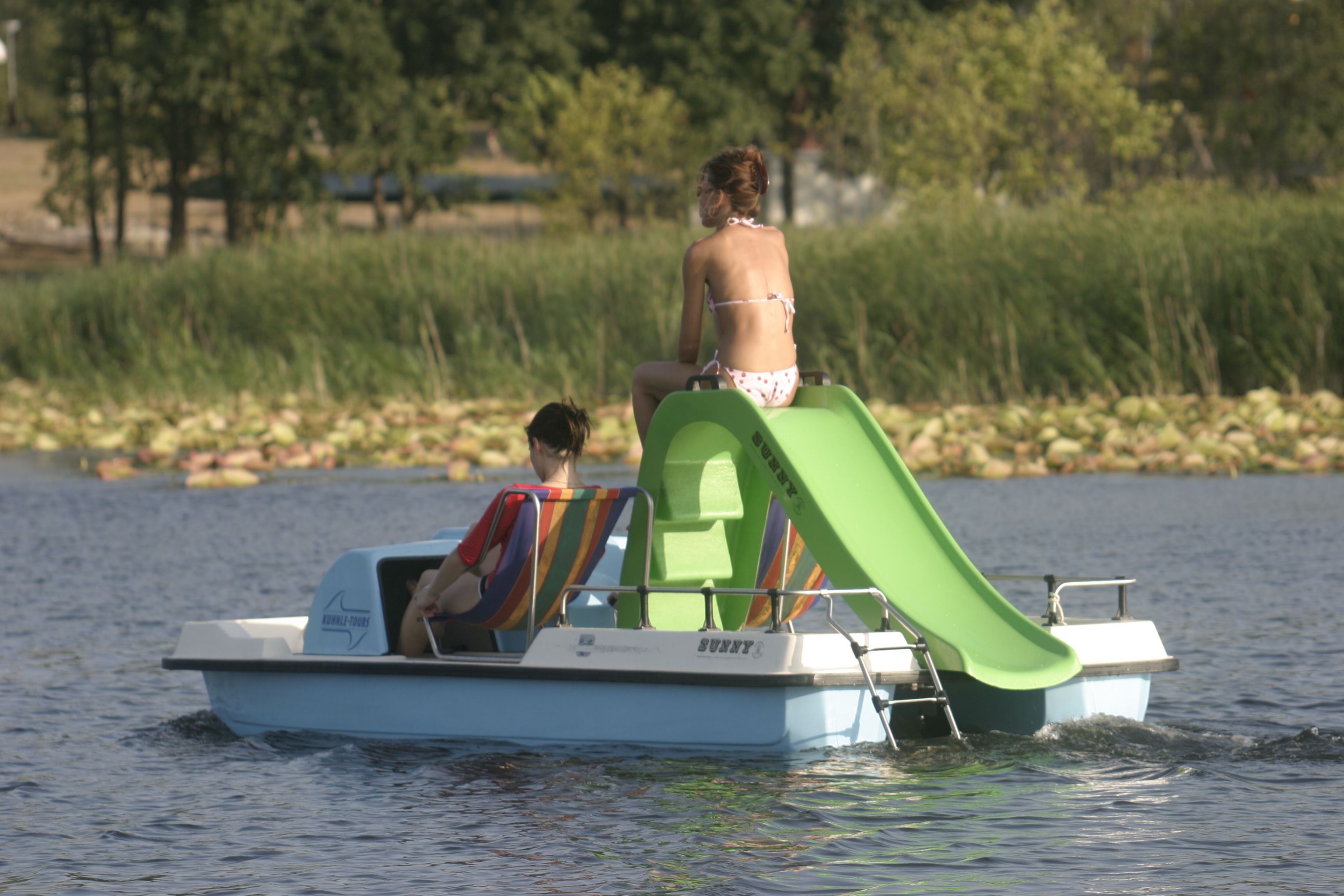Ein kleines Tretboot mit Wasserrutsche